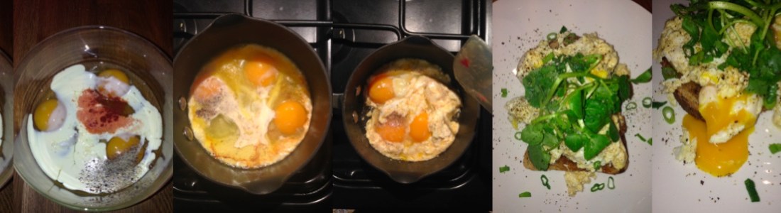 When I woke up this morning I fancied eggs. In all honesty I always fancy eggs. They’re one of the most versatile, tasty and (occasionally) healthiest foods on the planet. So here is recipe number one, my oozy scrambled eggs on malty wholegrain toast with fresh watercress and spring onions, just for a bit of a kick.