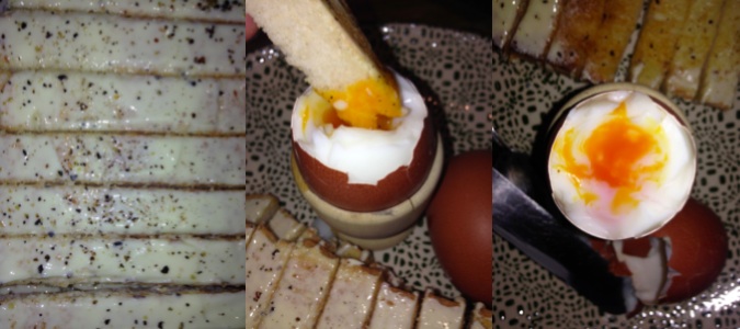 Get a pan of water on the hob and heat it to a rolling boil. Toast your bread before you put the eggs in the water. Set a timer for 4 and a half minutes and get you plate, cutlery and cup of tea ready. Lower your eggs into the water, set your timer and sort your soldiers out. Butter your bread, i like to twist the salt and pepper onto my soldiers, it’s easier than seasoning your eggs, and cut into 1cm think fingers. When your timer is done, quickly run the cold tap into the pan to prevent the eggs from cooking further. Even if there’s no water in the pan, if the eggs still feel warm they’re still cooking, so the cold water is a must! Pick out of the water, crack open and enjoy!
