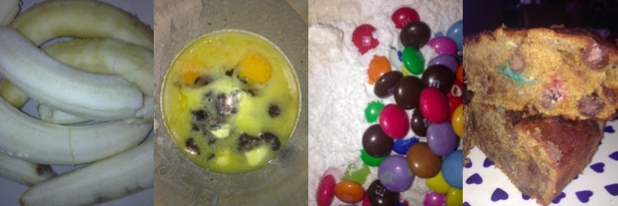 First of all, preheat your oven to 170C for a fan, 180C for a gas. Next, in a mixing bowl whisk up your butter, sugar and eggs til pale and doubled in size. If you’re doing this by hand it might take a while, so get your muscles ready. In a separate bowl give your bananas a good mash and in another bowl have all of your remaining ingredients together, ready to go in. When the egg mix is ready, fold in your dry ingredients til you can no longer see any flour. Then fold in your bananas. Next transfer the mix into a greased tin mould (or any mould, mine was in a heart tin!) sprinkle over some extra sugar and get it into your oven for about 45 mins, check it at 30 and make sure it’s on the lowest shelf in the oven! Keeping it low will ensure you don’t burn the top before the rest of it is cooked, and the sugar just gives it an extra crunch. Leave to cool a little, don’t share it and enjoy!