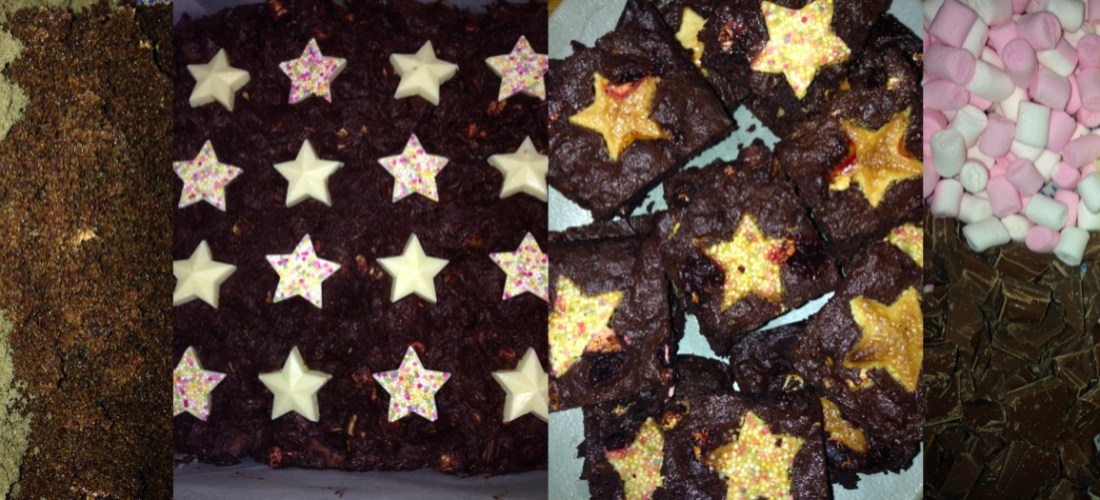 First thing you need to do is preheat your oven to 170C for a fan and 180C for a gas oven. Now, get your butter, sugars and vanilla flavouring into a food mixer, or into a big bowl ready for either a hand mixer or a big ole spoon and elbow grease if you’re feeling old-school. Get the mix really light and fluffy, this’ll make it easier to incorporate the eggs. Add your eggs one by one, then mix your flour, cocoa powder and extras by hand, it’s a really thick mix, so this last bit needs to be done with a spoon, just so you don’t over-mix. When the mixture’s ready, use a spatula to flatten it into a square tin lined with baking paper. Cook these babies for 25 minutes or until a cocktail stick inserted into it comes out clean. I know this next bit’s hard, but you’ve gotta let them cool for about 15-20 minutes before portioning, or it’ll just be a gooey mess! Put a picture on Instagram and enjoy!